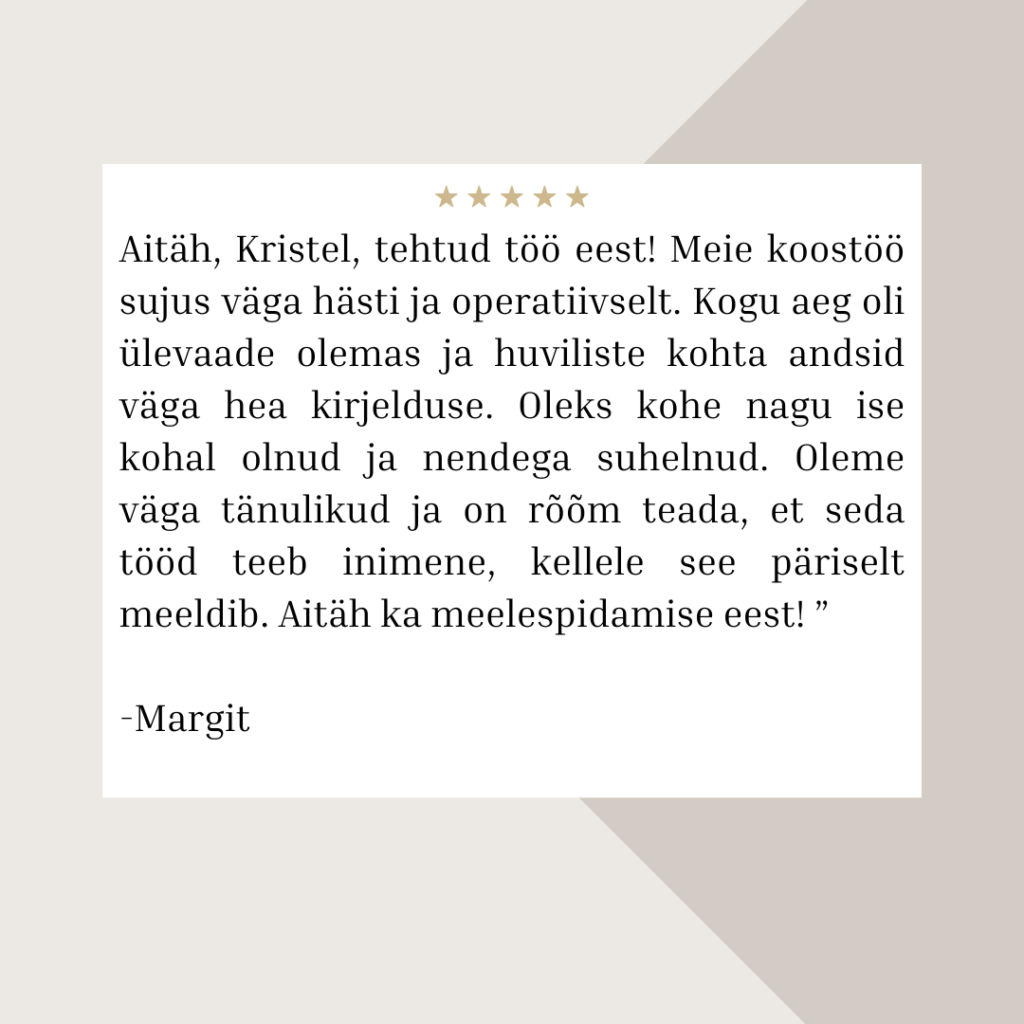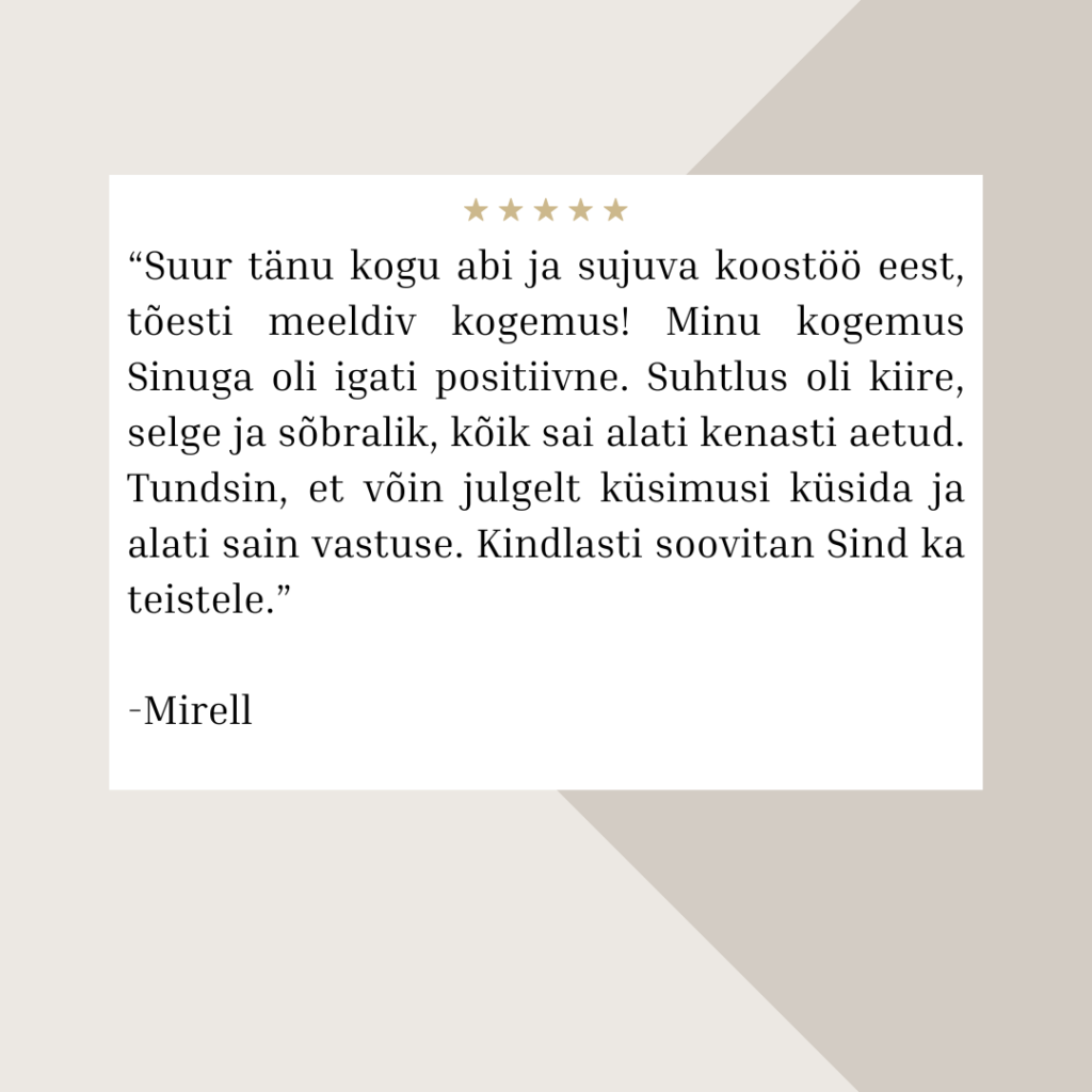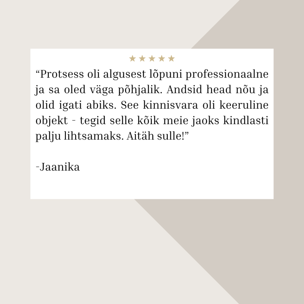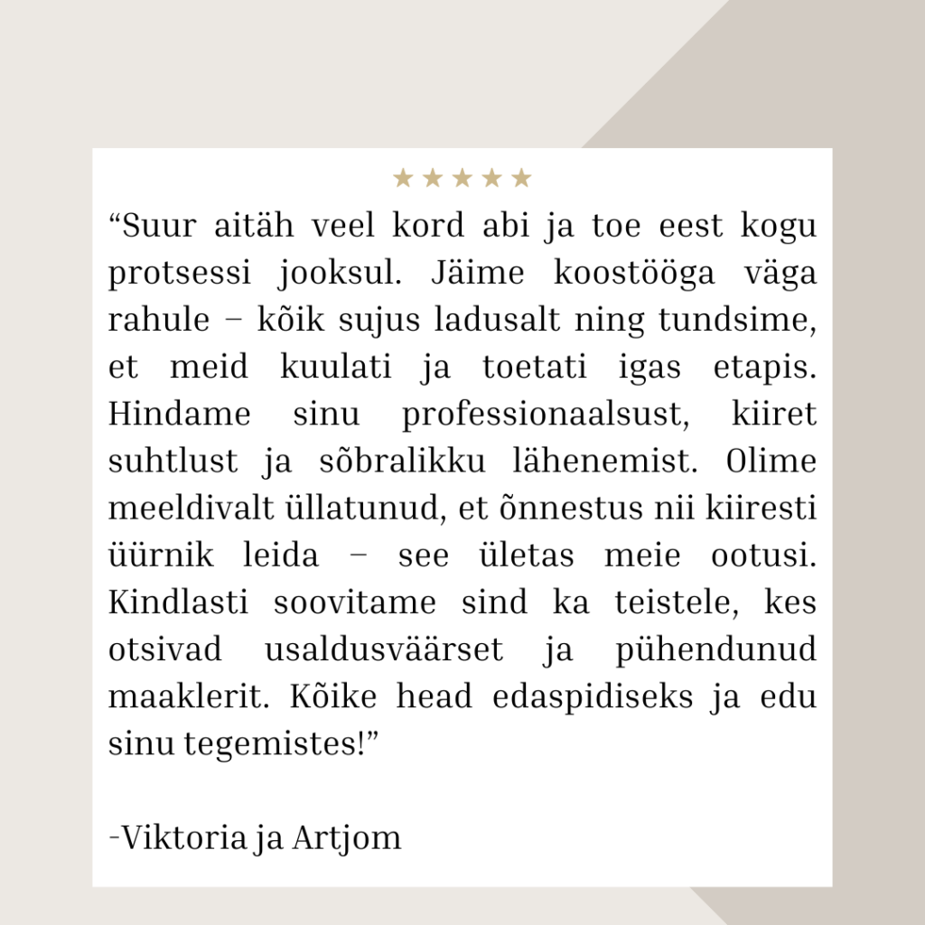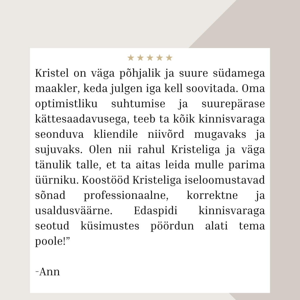 Klientide tagasiside Kinnisvara on minu kirg ning iga tehing põhineb usaldusel ja professionaalsusel.Olen tänulik enda klientidele, kes on mind usaldanud — nende kogemused on minu visiitkaart.